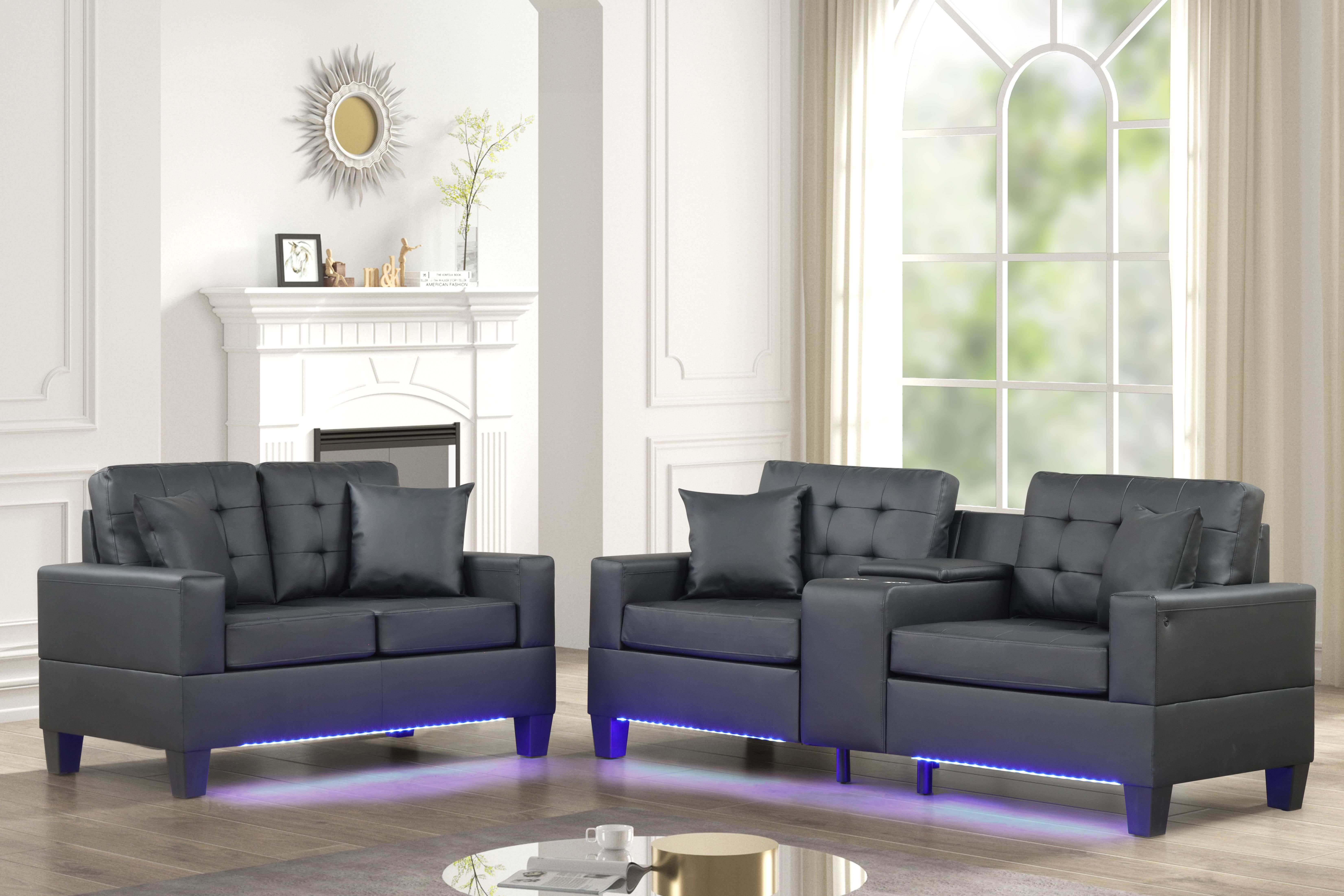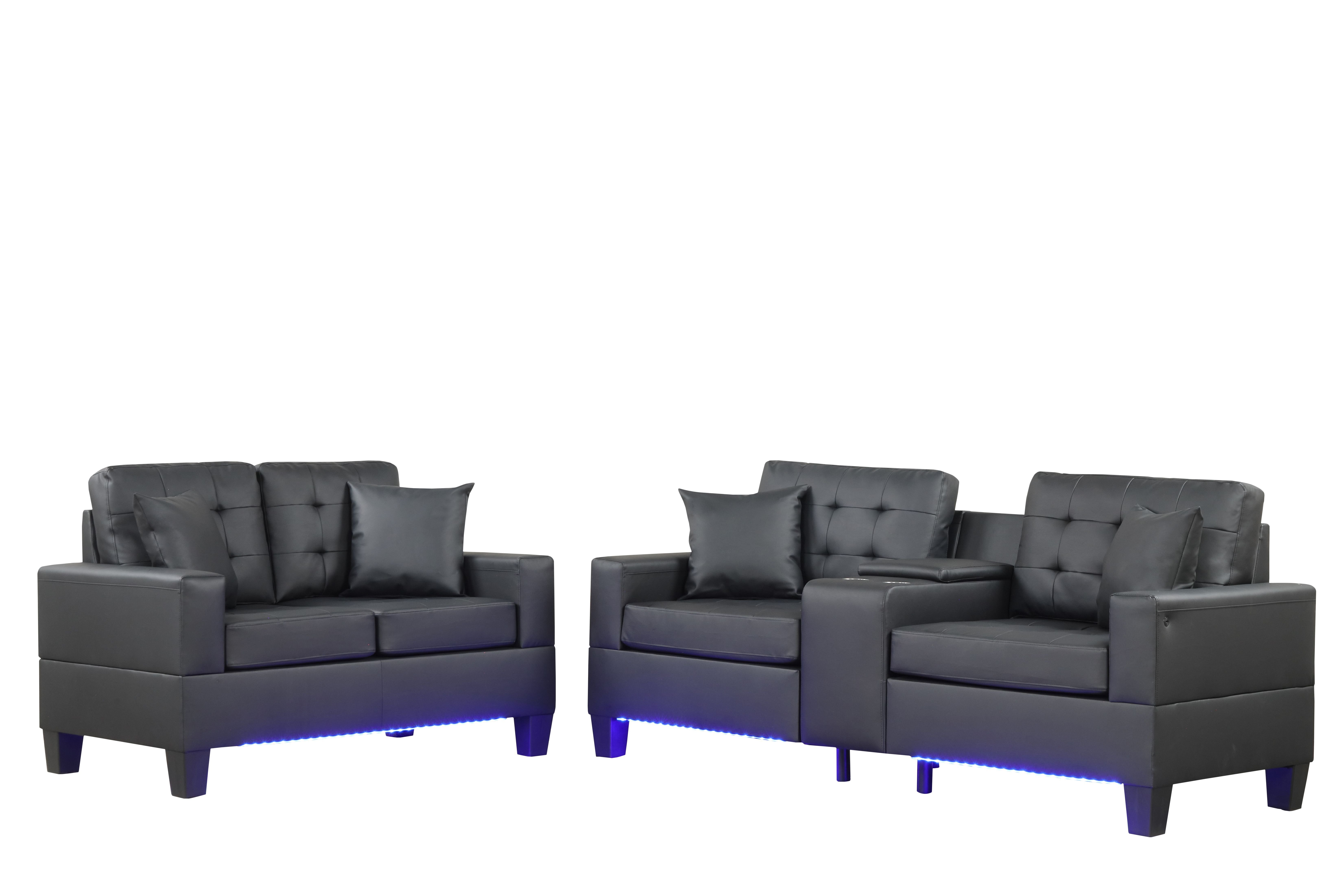 Genesis Black PVC Fabric Sofa Loveseat Living Room Set with LED Lights, USB Charger, Storage Console, Cupholders, Tufted Cushions