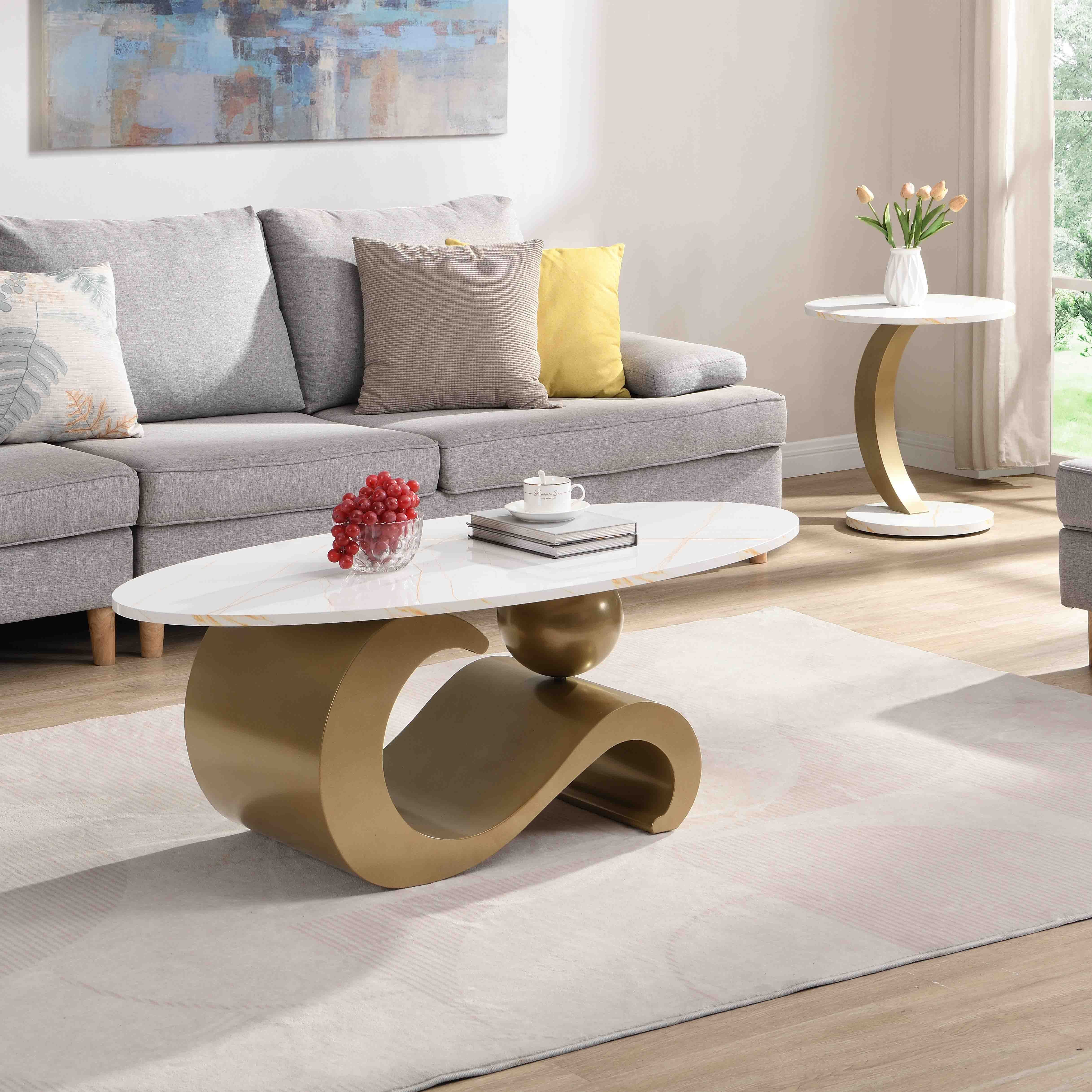 1. Elegant and Unique Design: Contemporary style adopts an authentic touch with the faux marble and golden metal frame Coffee Table and end table set. With special curve lines ensures an extremely elegant look and will allow it to be installed in any style of interior.
