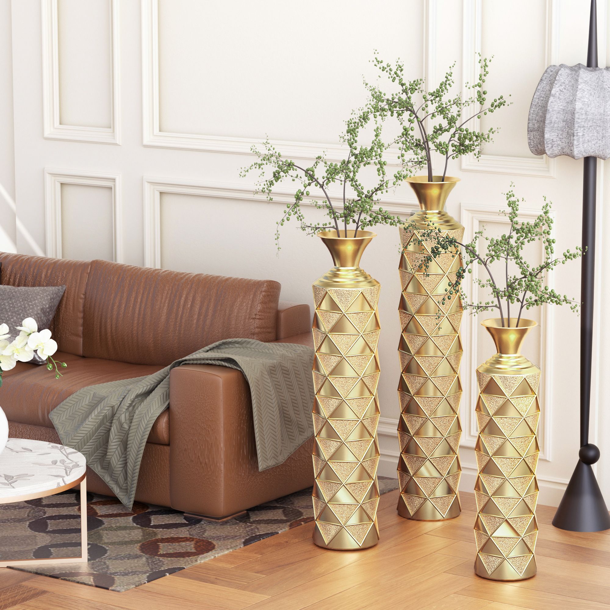 Metal decorative vase High Distress Metal center vase with 3D triangle pattern, set of 3 vases for home decoration 33.5 ", 29.5 ", 25.2 "high, gold Metal decorative vase High Distress Metal center vase with 3D triangle pattern, set of 3 vases for home decoration 33.5 ", 29.5 ", 25.2 "high, gold Metal decorative vase High Distress Metal center vase with 3D triangle pattern, set of 3 vases for home decoration 33.5 ", 29.5 ", 25.2 "high, gold