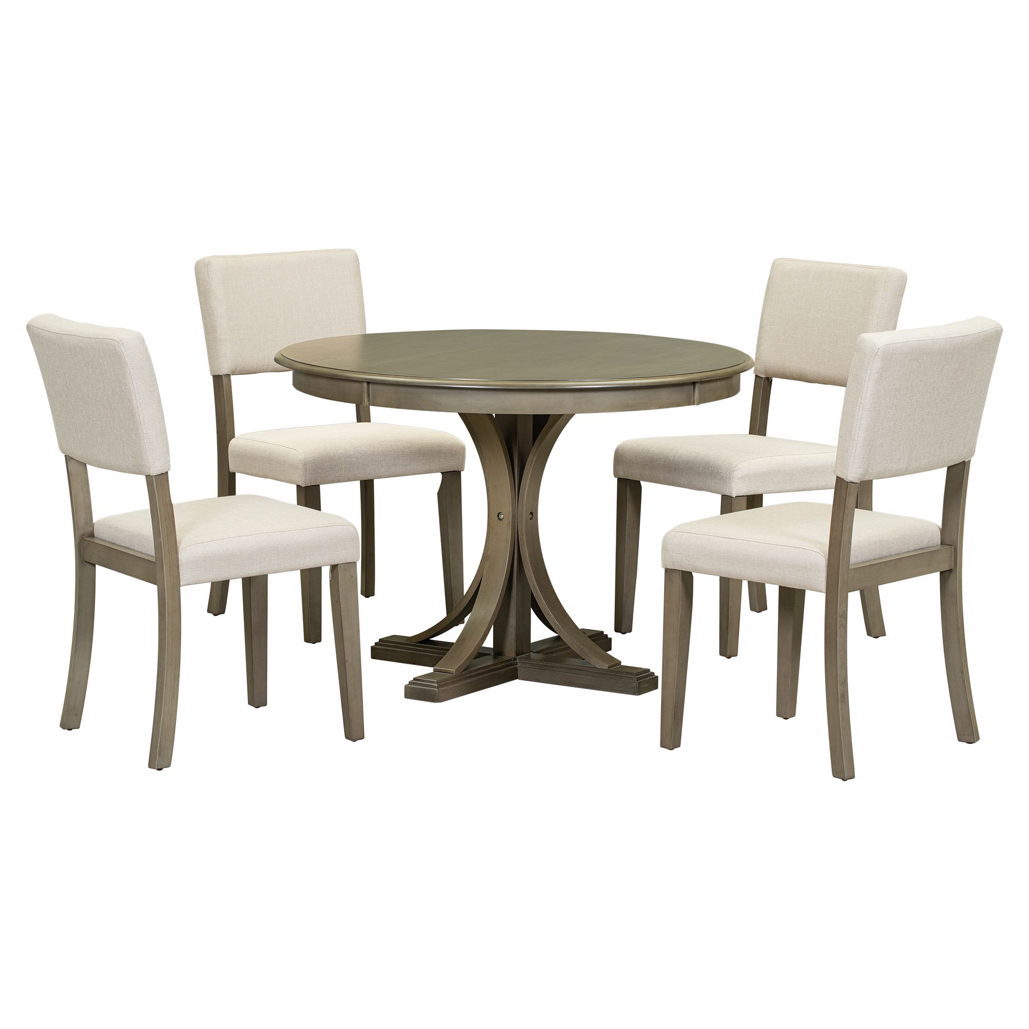 The 5-piece dining set is composed of one dining table and four chairs. Designed practically and compactly, it can easily fit into your space and seat up to four family members. Round table top with no sharp corners helps to protect your children and the elderly. The design takes into account the sense of use and comfort.