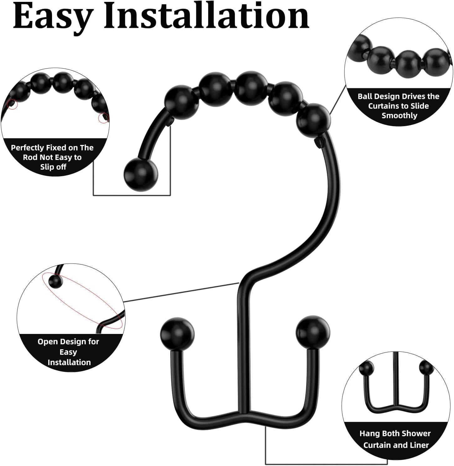 2.Smooth Sliding: Our shower curtain rings utilize a ball bearing design for smooth sliding. Say goodbye to jammed or noisy shower curtains and enjoy an effortless shower curtain experience.