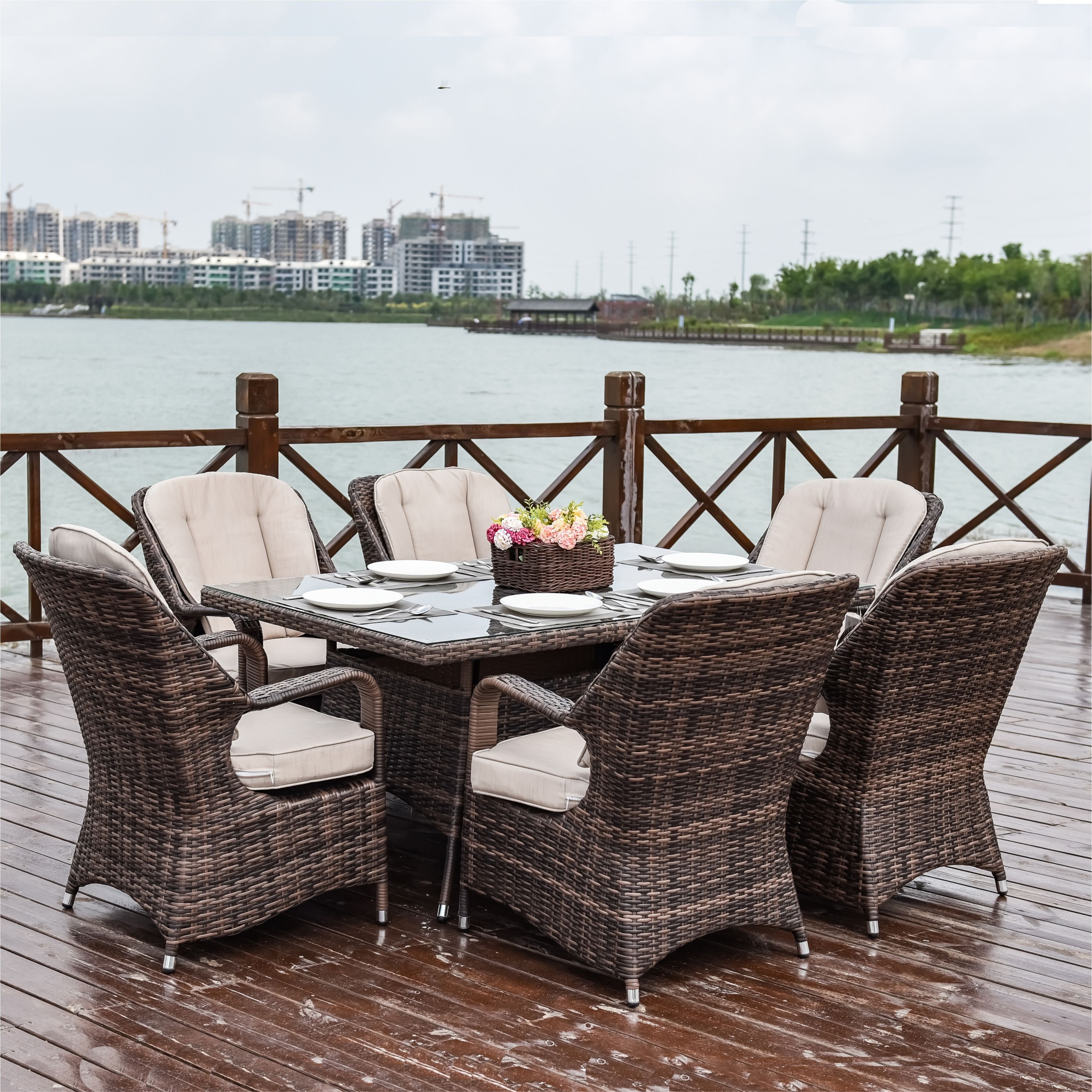 This deluxe dining set with 6 curved chairs offers supreme comfort; grandeur and sophistication for your garden. Made with the highest quality hand-woven rattan; the Cinderella dining set comes complete with tempered glass and seat cushions. With its circular table and cozy chairs; the Cinderella garden set is perfect for intimate alfresco dining. The Dining set is low-maintenance; frost proof; rust resistant and weather resistant. High-quality rattan. The rattan dining/lounge set is made from some of the highest grade brown rattan around - you can rest assured that the Cinderella has been designed and created to withstand not only the test of time but also the test of elements. Luxury high-quality cushions. The cushions on the Cinderella are durable and supremely thick; providing you with unparalleled comfort. The cushions are made from luxury fabric and also contain quick drying foam with washable covers; making them excellent for year round usage.