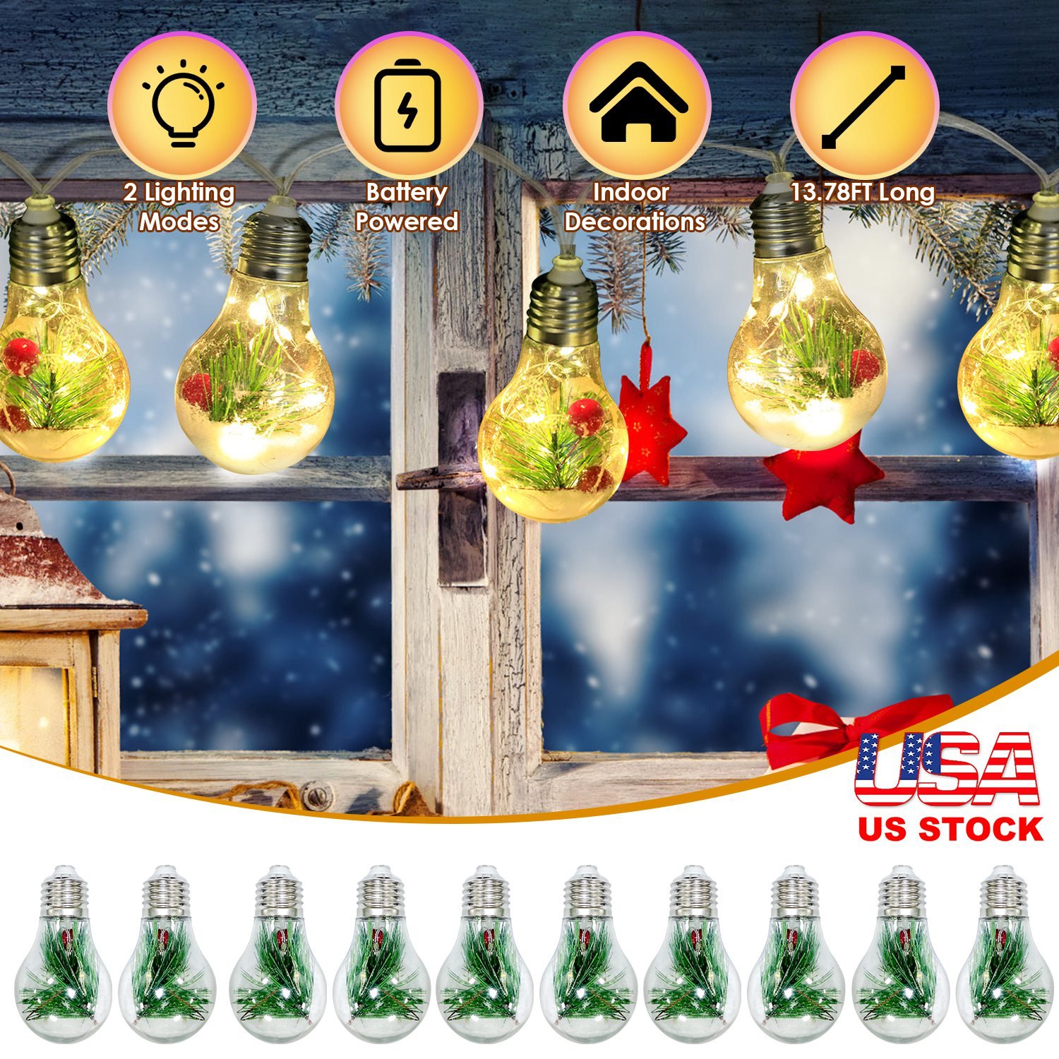 Home > 13.78FT Christmas Snow Globe String Light Battery Powered 10 LED Bulbs Indoor Christmas Lights with Pine Needles Snowflakes Berries