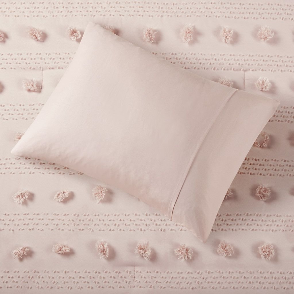 Refresh your bedroom with the elegant style of Intelligent Design's Lucy Clip Jacquard Comforter Set. This beautiful comforter features fun and playful clip jacquard pompoms all over the face that add dimension to the top of the bed for a lovely look. The matching shams (1 in Twin/TwinXL) also flaunt the delicate design of the comforter to complete the jacquard bedding set. Hypoallergenic polyester filling in the fashionable comforter contains no allergens and is treated to be dustproof. Machine washable for easy care, this elegant comforter set is OEKO-TEX certified, meaning it does not contain any harmful substances or chemicals to ensure quality comfort and wellness. An antimicrobial treatment helps reduce the growth of odor causing bacteria and keeps fabric lasting longer. Items may come in rolled or compressed packing and will need to be fluffed up. Use a steam iron to help remove wrinkles easier.