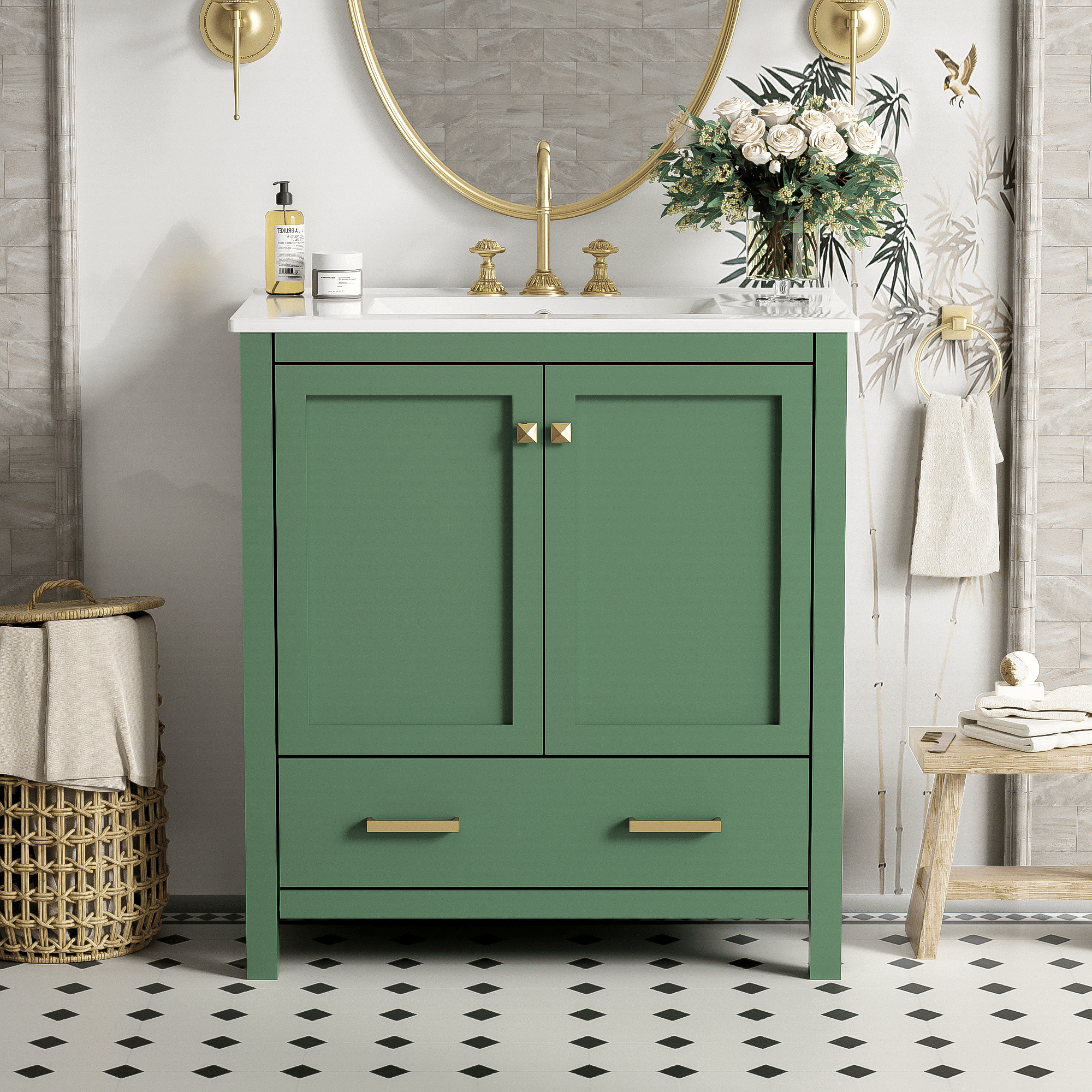 [Elegant and Stylish Appearance] Our 30-inch bathroom cabinet features sleek lines and modern design. With its sophisticated green exterior, stylish handles and white sink, it adds a touch of sparkle to your bathroom decor. The combination of style and functionality creates an inviting and beautiful atmosphere.