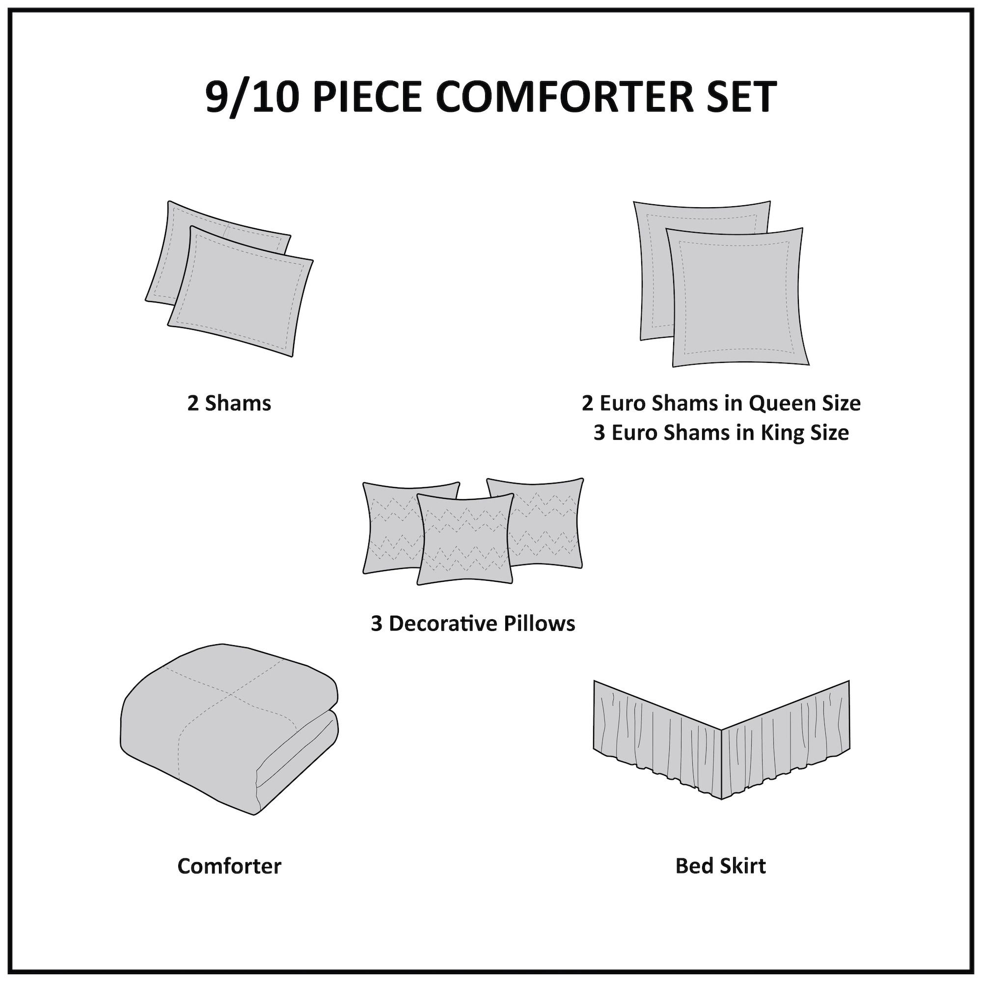 Set includes comforter, 2 shams, 2 euro shams (3 in King size), 3 decorative pillows, 1 adjustable bed skirt
