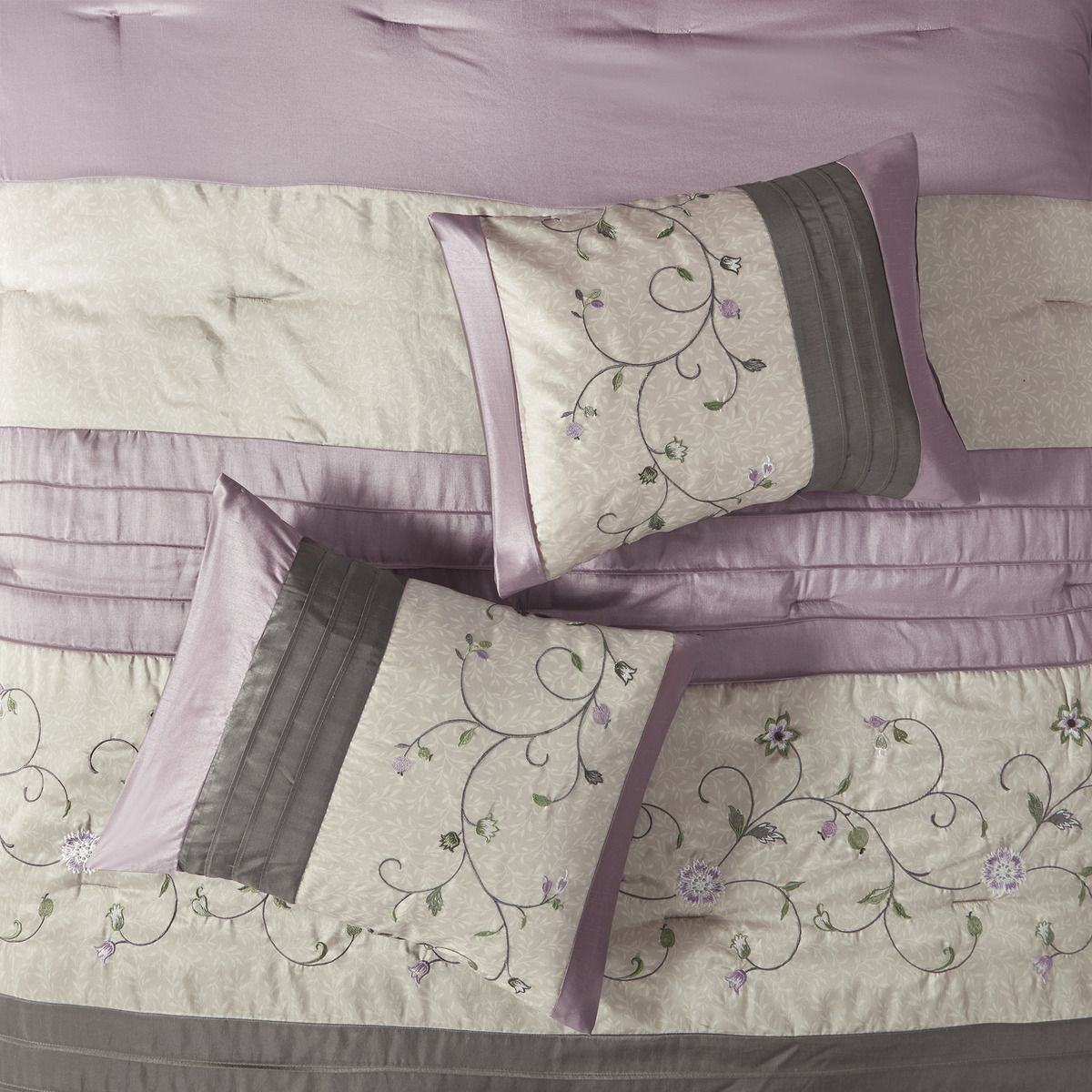 The Serene Bedding Collection provides an elegant look to your home. The top of the comforter is a mix of soft purple, charcoal grey, and light grey with piecing details while the light grey section has an embroidered floral pattern for a soft divide from these bold colors. Made from polyester dupioni, this fabric will produce a shine and pick up the light on both the comforter and shams. The decorative pillows come in a combination of solids, stripes, and embroidery to pull this whole set together. Items in the set may come in a rolled or compressed packaging, which will need to be fluffed up or steam ironed before use to remove wrinkles.