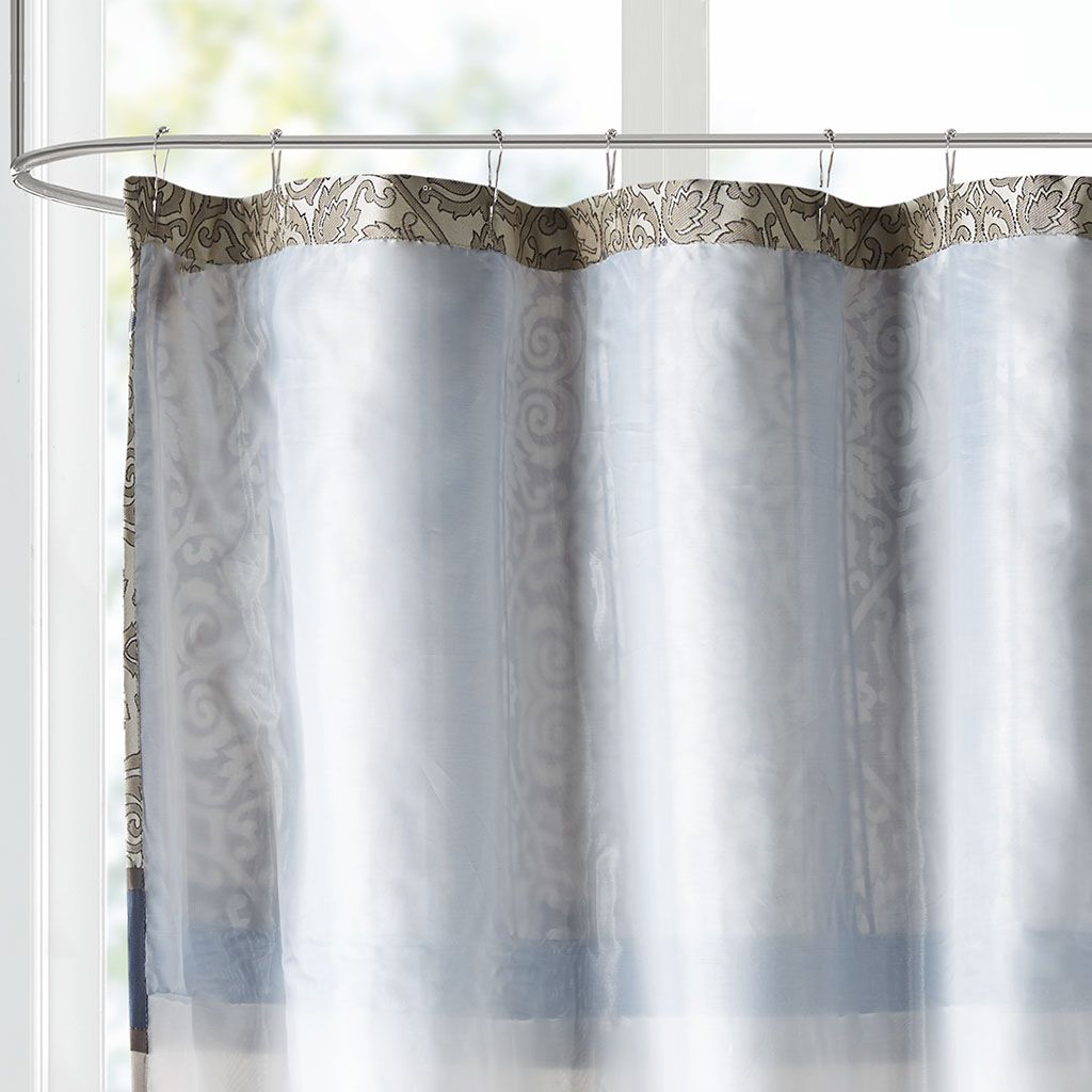 Add a touch of sophistication and elegance to your bathroom with the Donovan shower curtain. This stunning curtain features a bold color-blocked design that is accentuated with intricate embroidery details. The jacquard weave adds depth and texture to the curtain, showcasing a beautiful medallion pattern that gives an entirely new look to your bathroom decor. This collection also features coordinating bedding that is sold separately, allowing you to create a cohesive and stylish look throughout your entire bedroom and bathroom.