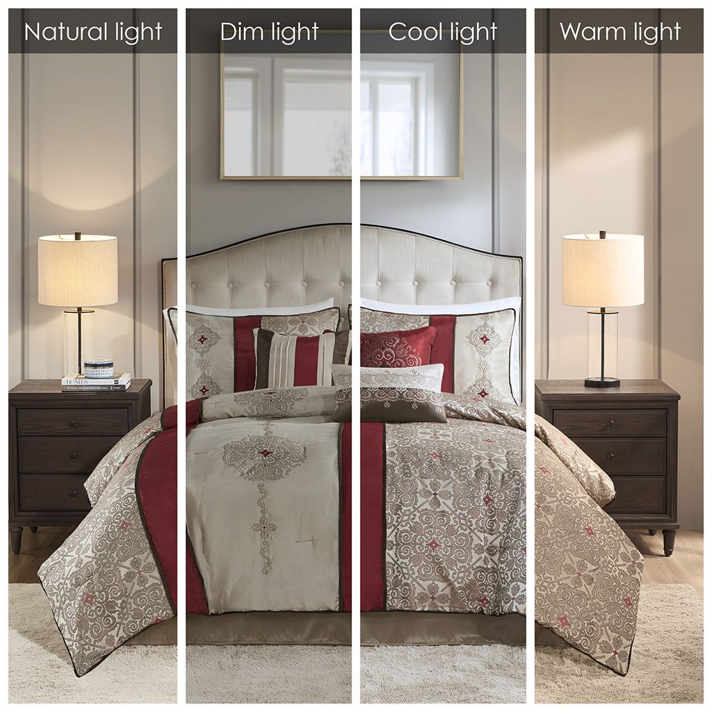 Donovan is an elegant update to your bedroom. This red comforter features a modern color blocked look with embroidered taupe details. The bold red stripes draw your eye into this beautiful comforter. Three decorative pillows further accentuate the colors and embroidered details in this collection. Also includes two standard shams which pull the whole look together. The comforter is made from 100% polyester and is machine washable for easy care. Items in the set may come in a rolled or compressed packaging, which will need to be fluffed up or steam ironed before use to remove wrinkles.