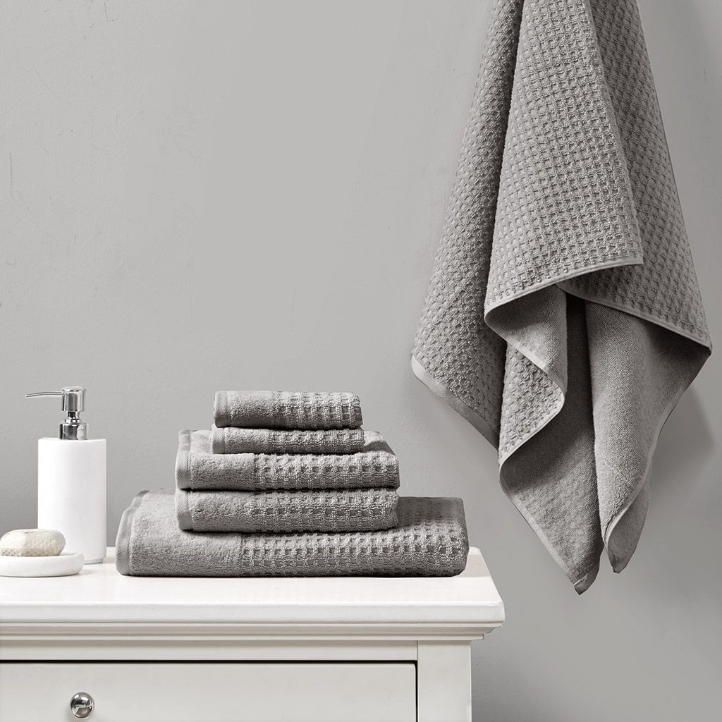 Our Madison Park Spa Waffle Cotton Towel 6 Piece Set provides the perfect textured update to your bathroom decor. This 100% cotton towel set features an all-over waffle combed jacquard design for a rich texture, while the velour dobby cuff adds a stylish contrast touch for an updated look and feel. The 600gsm weight makes each towel soft yet also lightweight and quick-drying, so it does not get weighed down from moisture throughout the day. These towels are also finished with a SILVADUR™ antimicrobial treatment providing built in freshness protection, inhibiting growth of odor causing bacteria, and keeping linen newer, longer. Active for multiple washes, this treatment delivers long-lasting durable odor protection performance. In addition, this towel set is also Made in Green by OEKO-TEX certified, meaning they do not include any harmful substances or chemicals while also using sustainable processes and socially responsible working conditions, for the best in quality comfort and wellness. Complete the look with coordinating Spa Rug and Spa Waffle Shower Curtains, available and sold separately. Set includes: 2 standard 28x54" bath towels, 2 standard 16x26" hand towels, and 2 standard 12x12" wash towels.