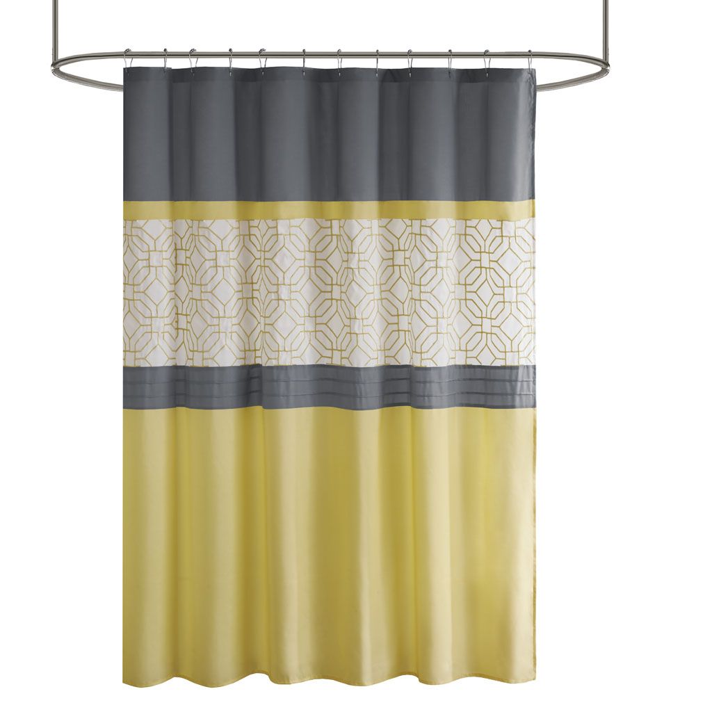 The 510 Design Donnell Embroidered and Pieced Shower Curtain offers a fresh update to your bathroom. A pintucked and pieced design is featured in grey and yellow hues, for a simple updated look to your decor. An embroidered geometric design adds texture and dimension, while an added lining provides better drapability and an extra layer of privacy. Made from soft microfiber, this pieced shower curtain brings a refreshing touch to your bathroom decor.