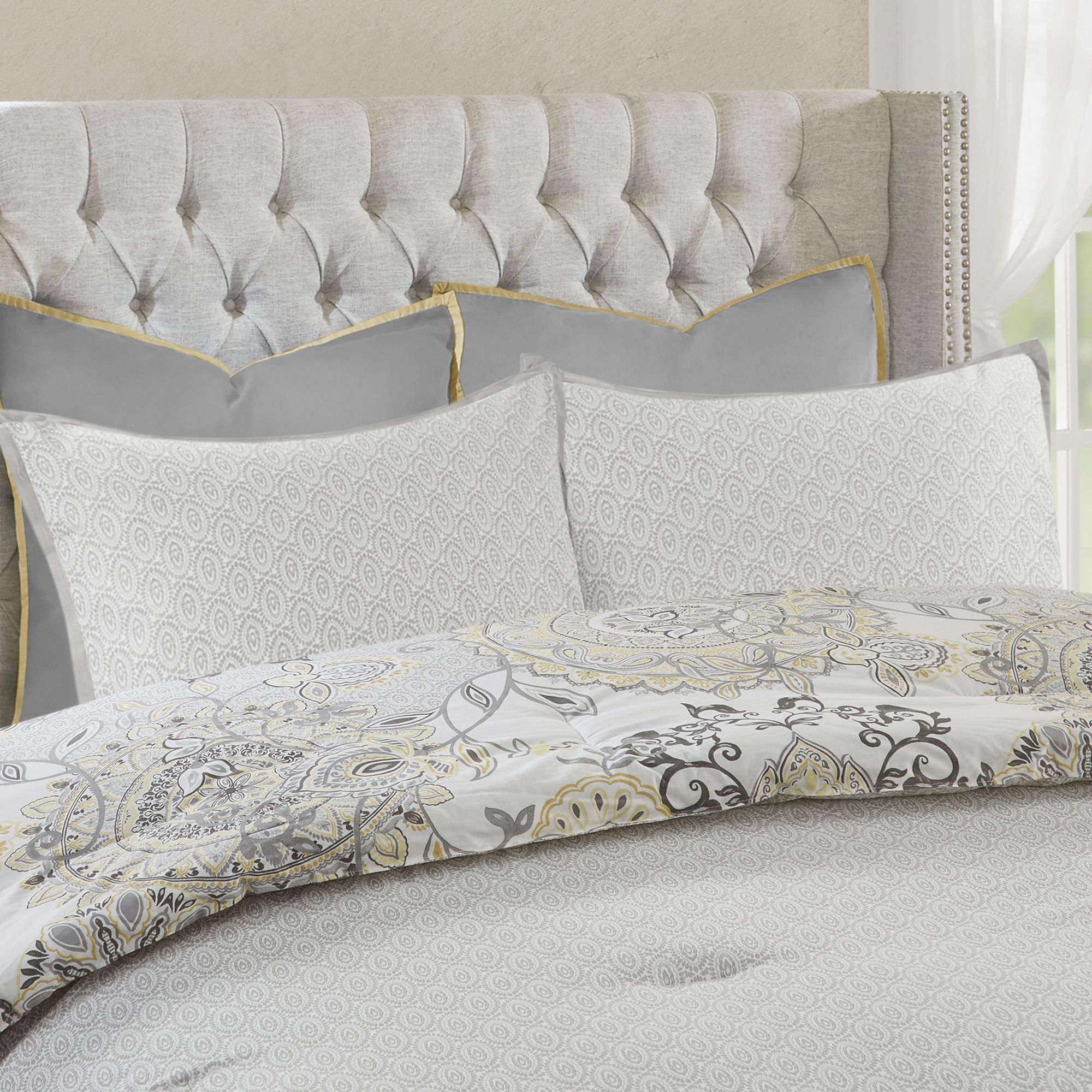Set includes comforter, 2 euro shams, 2 matching shams, 2 decorative pillows and 1 bed skirt